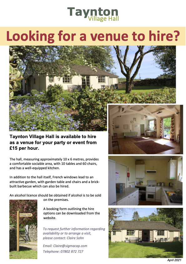 Taynton Village Hall regularly hosts events such as Taynton Talks, quiz nights, cocktails and drinks evenings, summer barbecues and wine tastings, which are open to the public.